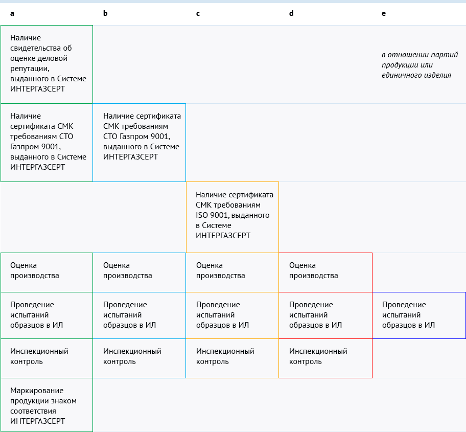 Подробное описание и принцип выбора схем сертификации приведены в документе Системы № ОГН0.RU.0101 Правила функционирования системы добровольной сертификации ИНТЕРГАЗСЕРТ (Приложение Г) https://www.intergazcert.ru/fileadmin/f/about/documents/OGN0.RU.0101.pdf